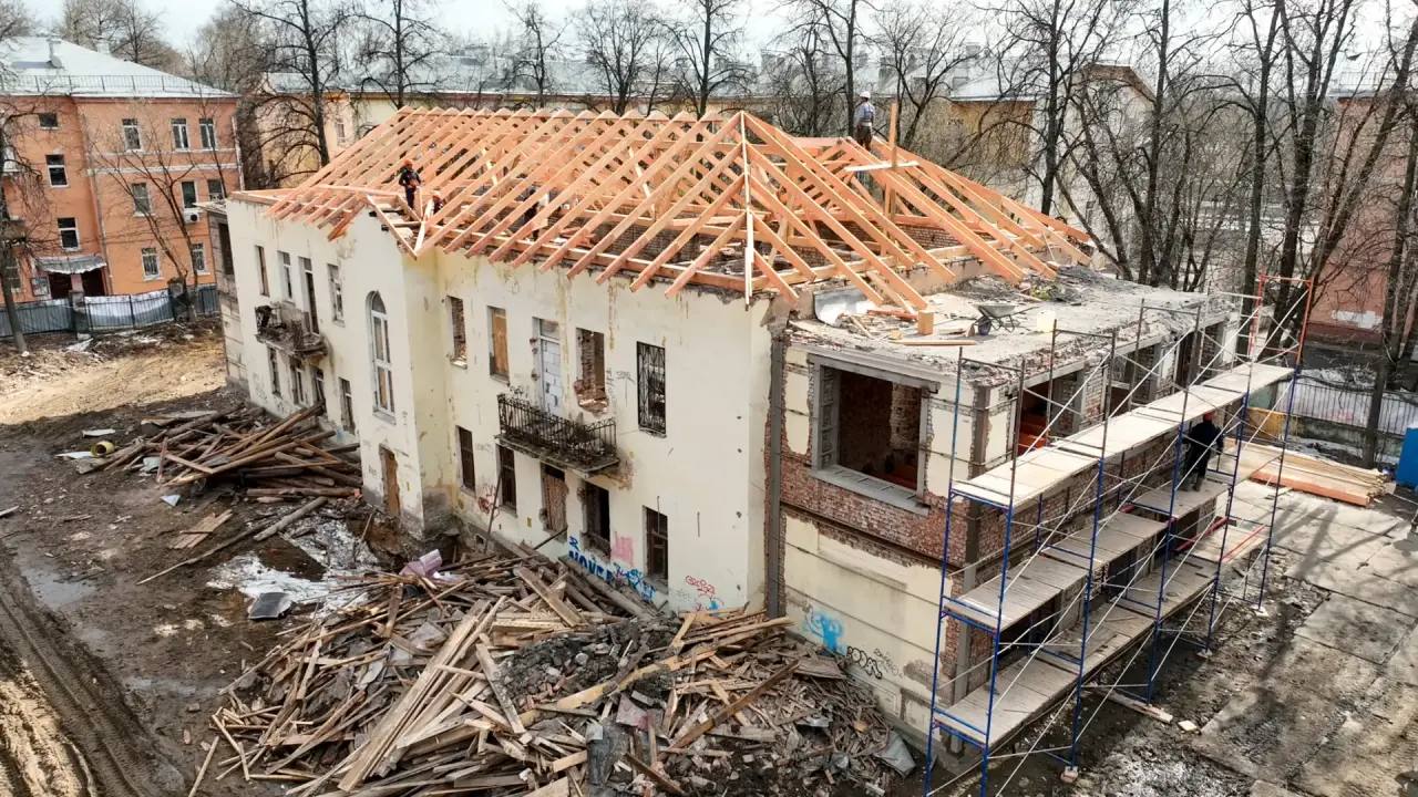 Специалисты уже усилили оконные и дверные проемы пристроек. В настоящее время ведется устройство стропильной системы, а также монтаж перекрытия I этажа в пристройке. В ближайшее время строители приступят к замене инженерных сетей.