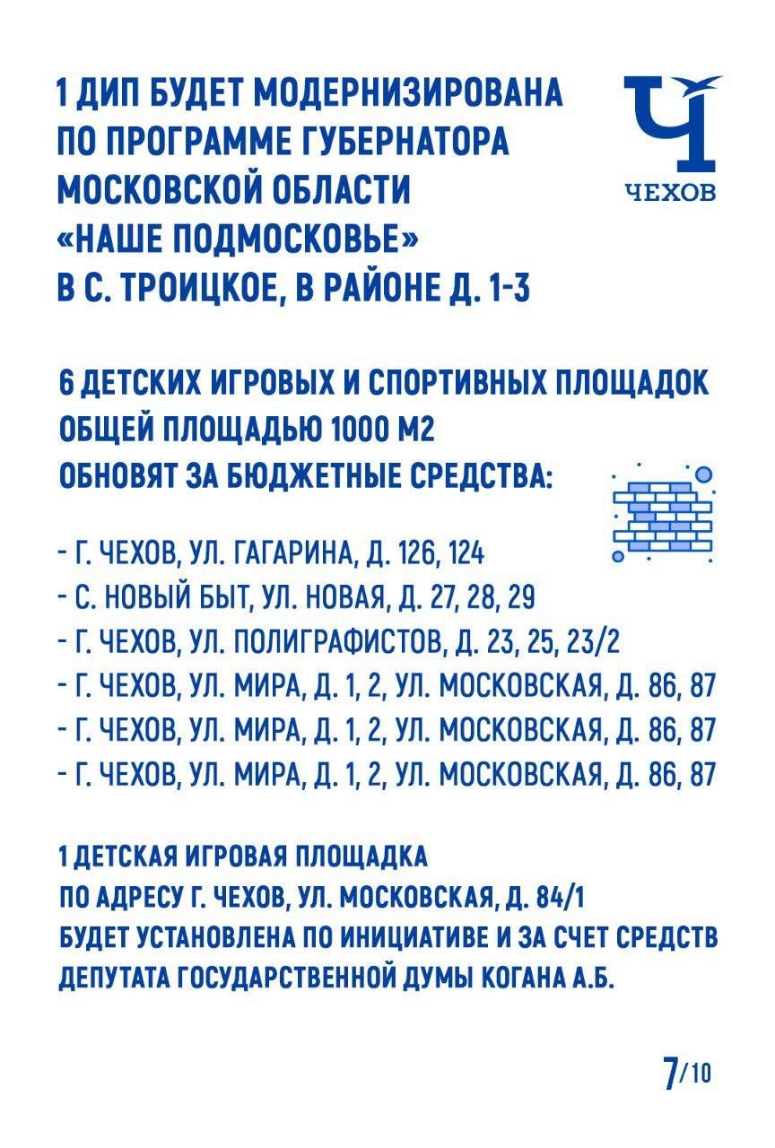 Продолжим преображать наши дворы и реконструировать детские площадки, ремонтировать дороги и тротуары, обустраивать народные тропы и освещать населенные пункты. Впервые в рамках муниципального бюджета в пяти деревнях: Углешня, Чудиново, Васькино, Солодовка, Панино установим компактные игровые комплексы. Более подробно с адресами можно ознакомиться в наших карточках.