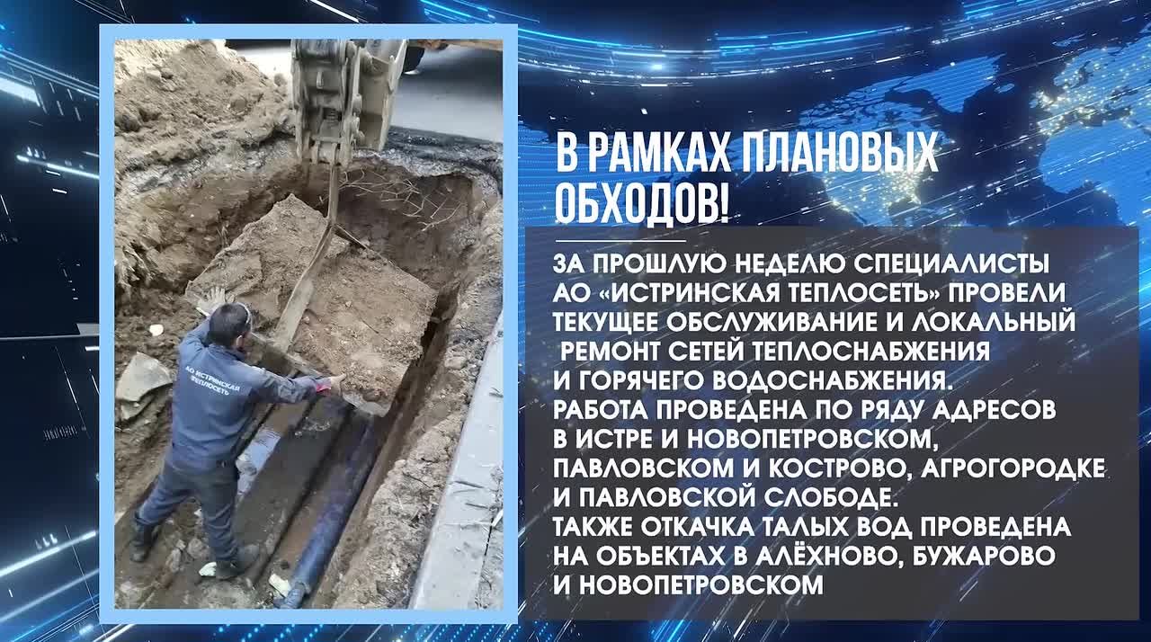В рамках плановых обходов! За прошлую неделю специалисты АО «Истринская теплосеть» провели текущее обслуживание и локальный ремонт сетей теплоснабжения и горячего водоснабжения. Работа проведена по ряду адресов в Истре и Новопетровском, Павловском и Кострово, Агрогородке и Павловской Слободе. Также откачка талых вод проведена на объектах в Алёхново, Бужарово и Новопетровском.