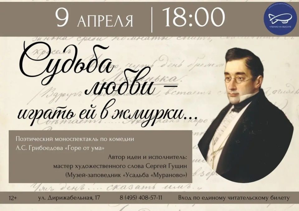 9 апреля в Центральной библиотеке Долгопрудного пройдёт уникальное мероприятие. В рамках проекта «БиблиоТеатр» на сцене библиотечного пространства состоится художественное чтение комедии Александра Грибоедова «Горе от ума».