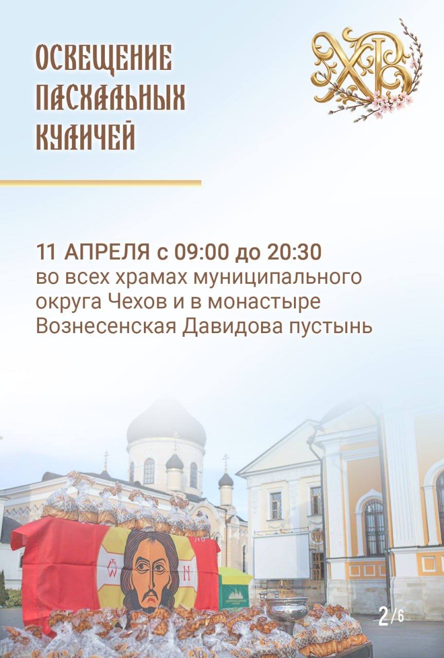 11 апреля с 9:00 до 20:30 во всех храмах и монастыре Вознесенская Давидова пустынь будет проходить освящение пасхальных куличей.