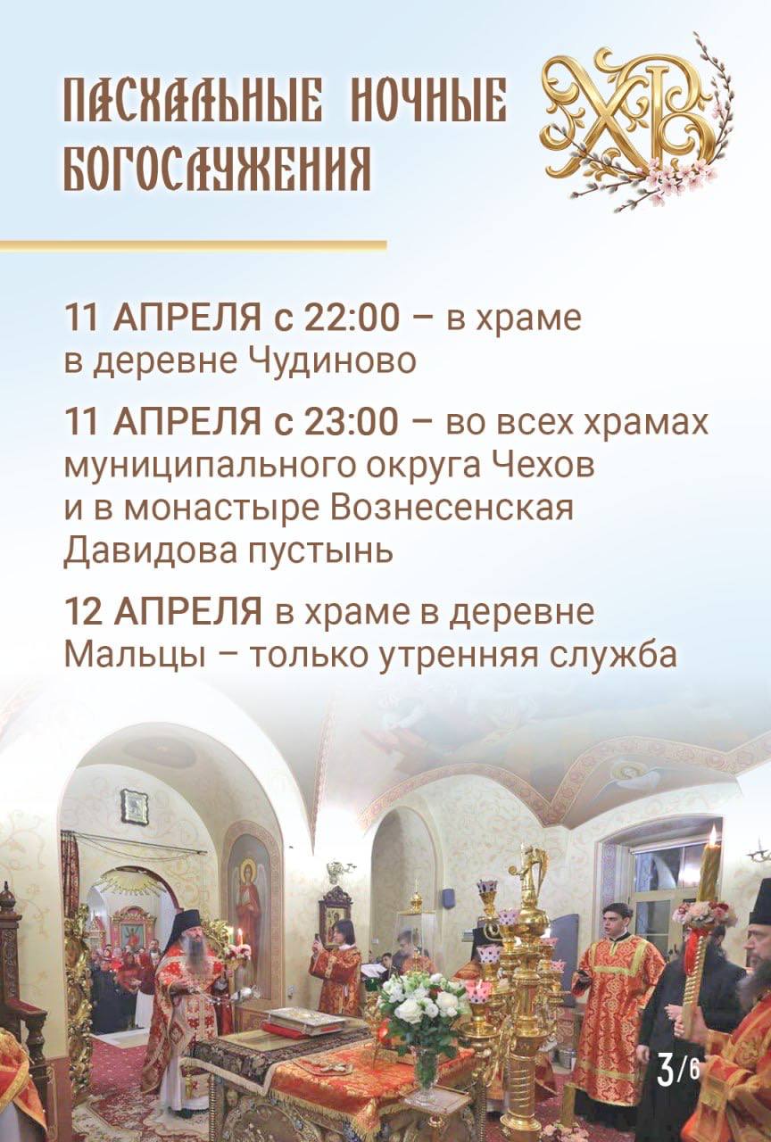 Ночные богослужения начнутся 11 апреля в 23:00 и продлятся до 4 утра, кроме храма в деревне Чудиново, там служба начнется в 22:00 и храма в д. Мальцы, где запланирована только утренняя служба 12 апреля.
