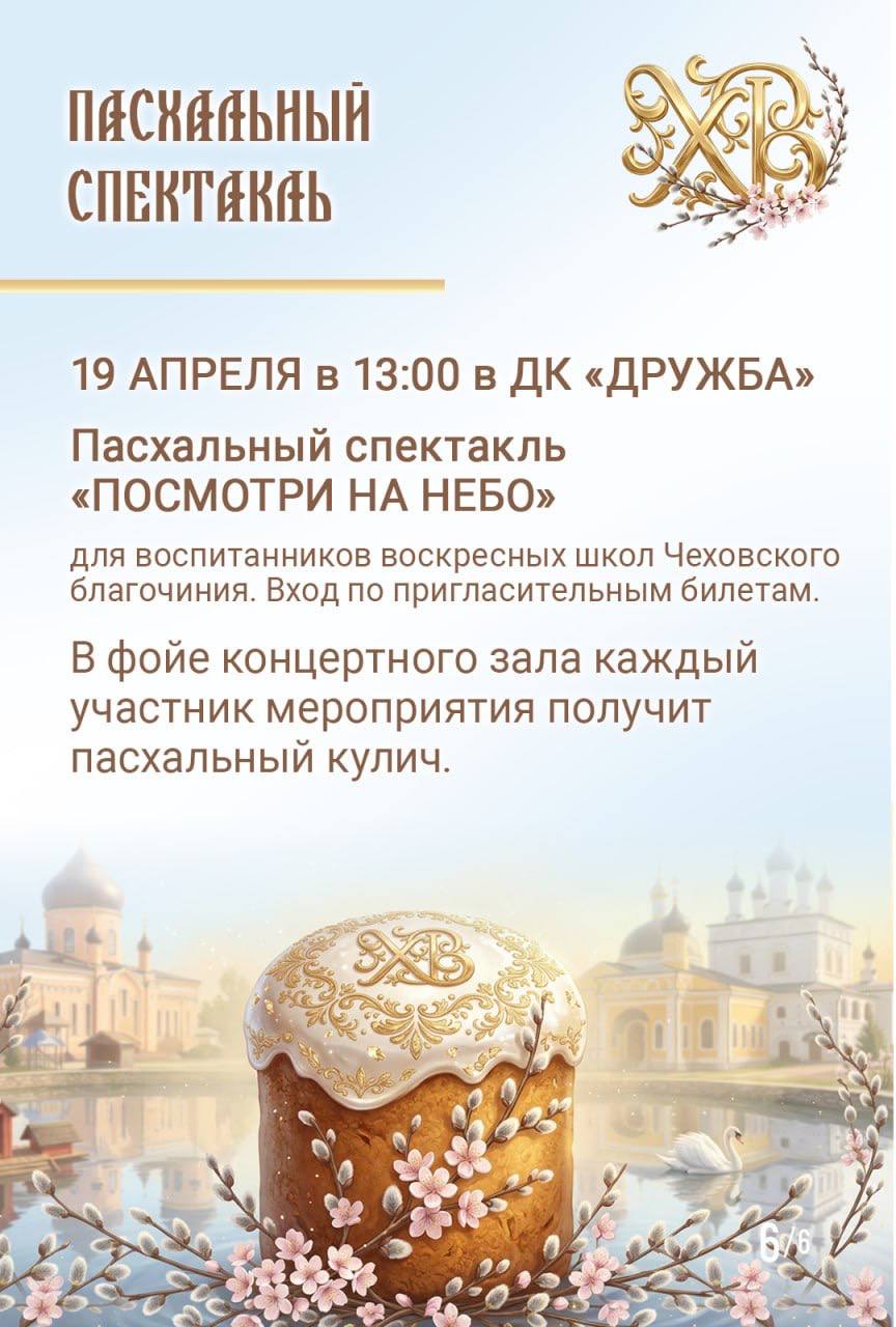 В воскресенье, 19 апреля в 13:00 в концертном зале ДК «Дружба» состоится пасхальный спектакль «Посмотри на небо». Он посвящен Воскресению Господа Иисуса Христа и создан на основе Евангельских событий. Участниками мероприятия являются воспитанники воскресных школ и прихожане Иоанно-Предтеченского Храма города Чехов, а также творческие коллективы и артисты культурно-творческой дирекции. Вход будет осуществляться по пригласительным билетам.