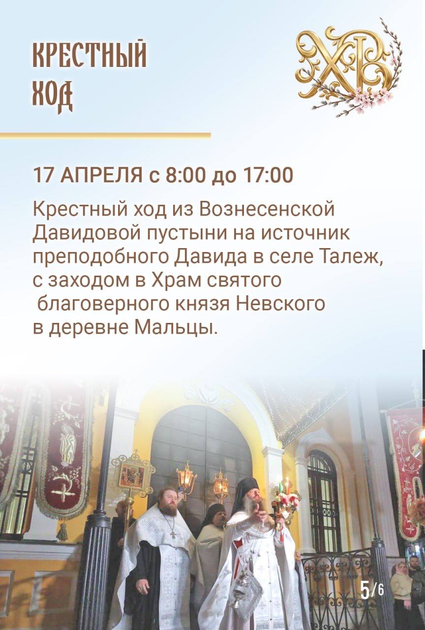 17 апреля по инициативе и благословению благочинного Чеховского церковного округа и монастырей Подольской епархии, настоятеля монастыря Вознесенская Давидова пустынь игумена Сергия (Куксова) состоится Крестный ход из Вознесенской Давидовой пустыни на источник преподобного Давида в селе Талеж, с заходом в Храм святого благоверного князя Невского в деревне Мальцы. Крестный ход начнется в 8 утра с божественной Литургии в летнем Алтаре перед Знаменским Храмом обители и завершится в 17:00 концертом хора Вознесенской Давидовой пустыни. Перед этим пройдет Молебен иконе Матери Божьей «Живописный Источник» на источнике преподобного Давида на подворье обители в с. Талеж.