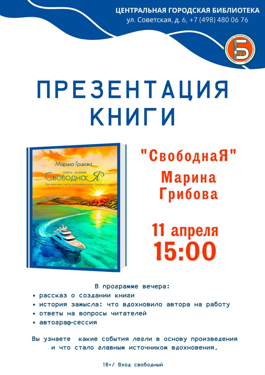 11 апреля в 15:00 в Центральной городской библиотеке по адресу: улица Советская, дом 6, состоится презентация дебютной книги жуковской писательницы Марины Грибовой «СвободнаЯ».