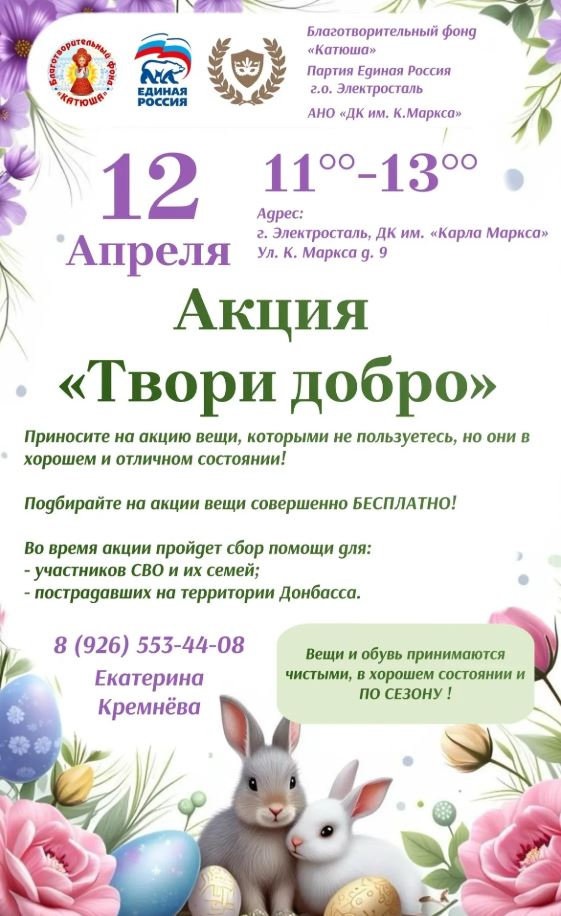 12 апреля в Доме культуры им. Карла Маркса с 11:00 до 14:00 при поддержке партии «Единая Россия» состоится праздничная пасхальная акция, в которой примут участие депутаты и представители администрации г.о. Электросталь.