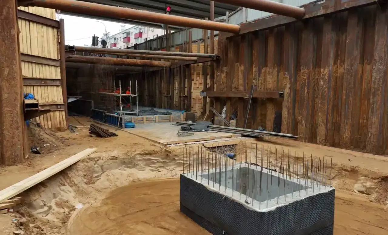 Специалисты уже разработали котлован, забетонировали два лестничных схода — на последнем приступили к монтажу опор кровли, обустроили дренажную систему и завершают подготовку к заливке бетонной плиты пола перехода.