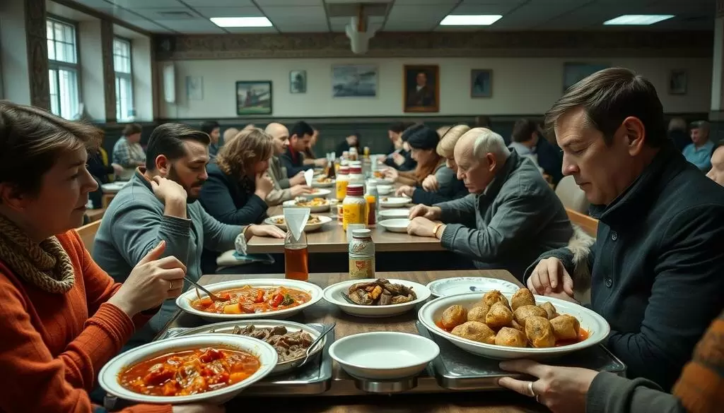 Сцена, наполненная ностальгией, оживляет образы советской столовой, где люди с удовольствием лакомились простыми, но сытными блюдами, такими как борщ и котлеты. Такие заведения ассоциируются у многих с настоящим вкусом, тогда как рестораны порой воспринимались как места для показухи и дефицита. Эта ностальгия обрела свои корни в особенностях общепита СССР, где рациональность и доступность стояли на первом месте.