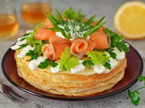 Сборка проста: слой блинов, затем немного сыра, кусочки семги. Каждый слой слегка прижимается, чтобы торт был аккуратным. Укладывайте блины чередуя стороны, чтобы края не выглядели неаккуратно.