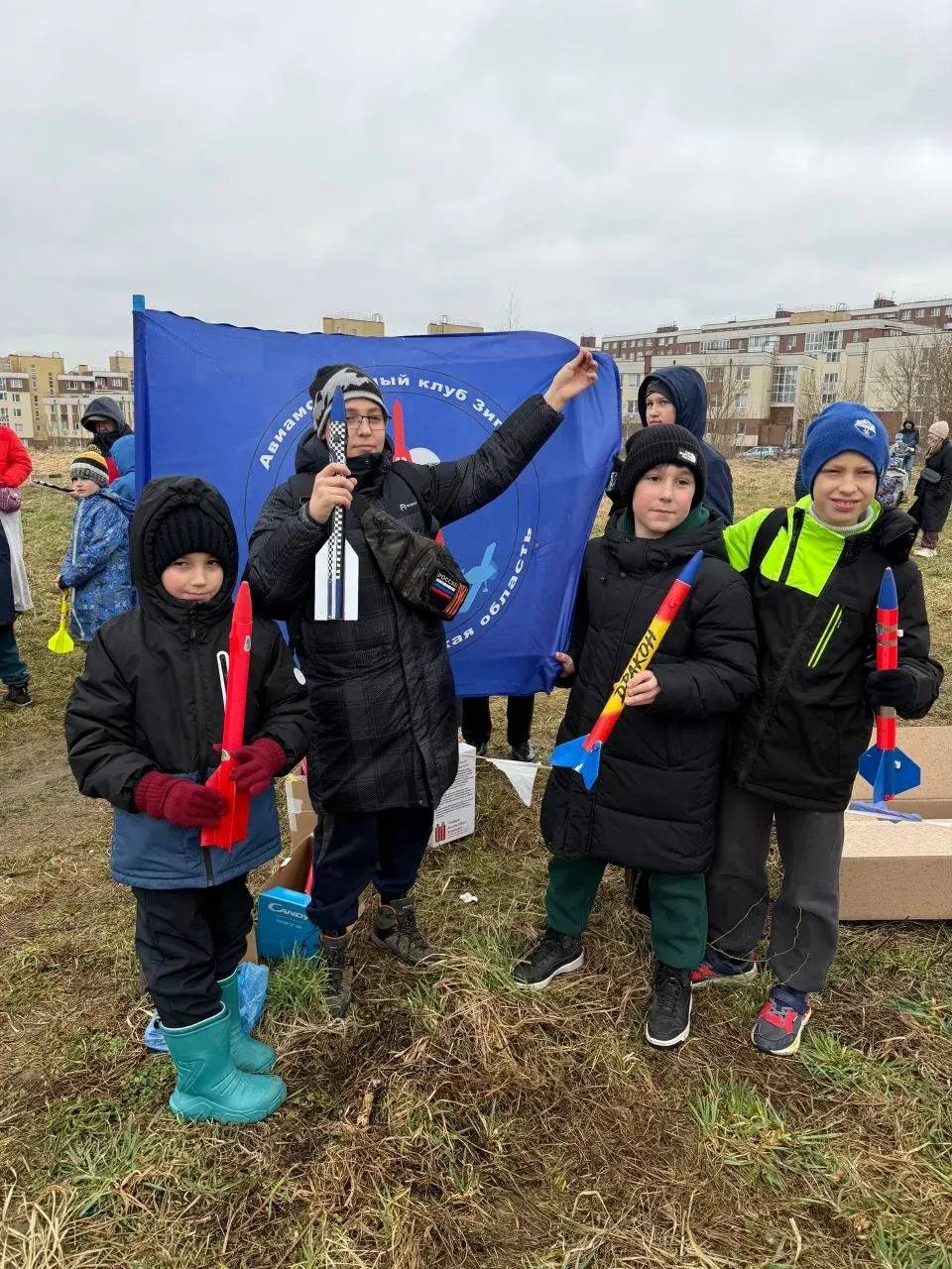 Ученики авиамодельного клуба «Зигзаг» запустили в небо 65 моделей ракет разных типов и размеров в честь 65летия полёта Юрия Гагарина.
