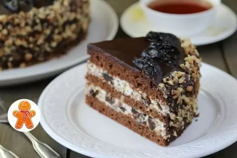 Торт помещается в холодильник на несколько часов для стабилизации. После чего глазируется растопленным шоколадом с маслом, украшенным орехами и черносливом. Уникальный торт «Чернослив в шоколаде» готов к подаче!