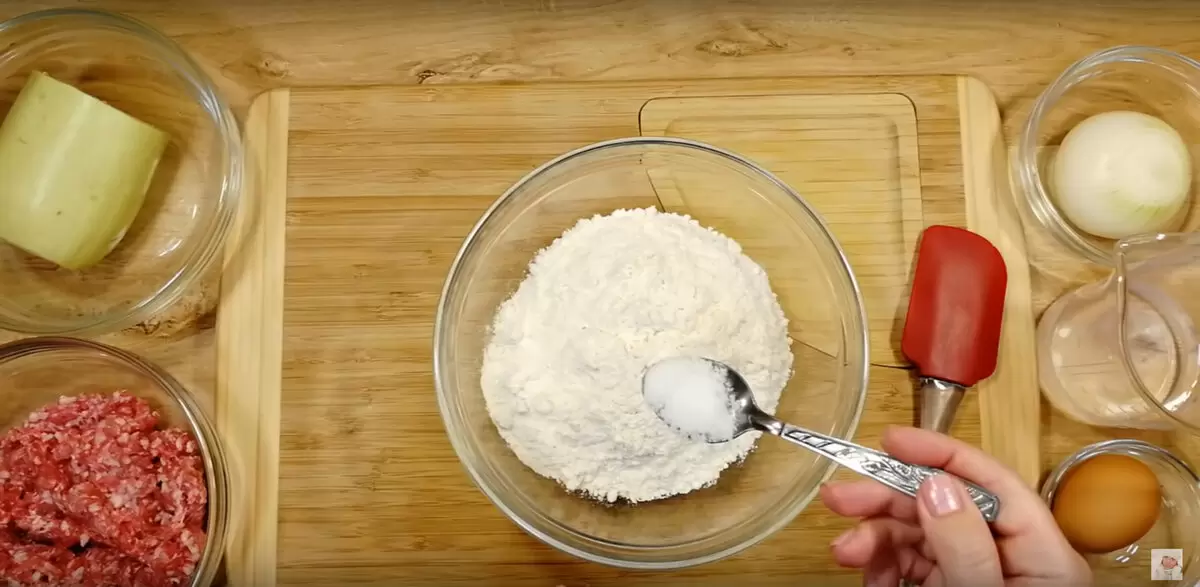 Тем временем можно заняться начинкой. Кабачок натереть на крупной терке и посолить, чтобы удалить лишнюю влагу. Лук нарезается полукольцами, добавляется сахар и соль, чтобы выделить сок. Фарш приправляется солью, перцем и перцем чили. Лук и отжатый кабачок добавляются к фаршу, все аккуратно перемешивается.