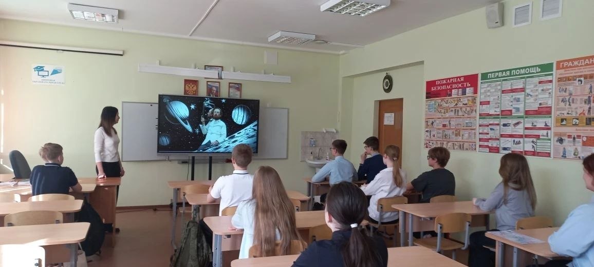 После линейки все отправились на классный час из цикла Разговоры о важном, которые сегодня были посвящены теме: «65 лет триумфа. 80 лет космической отрасли. Ко Дню космонавтики».