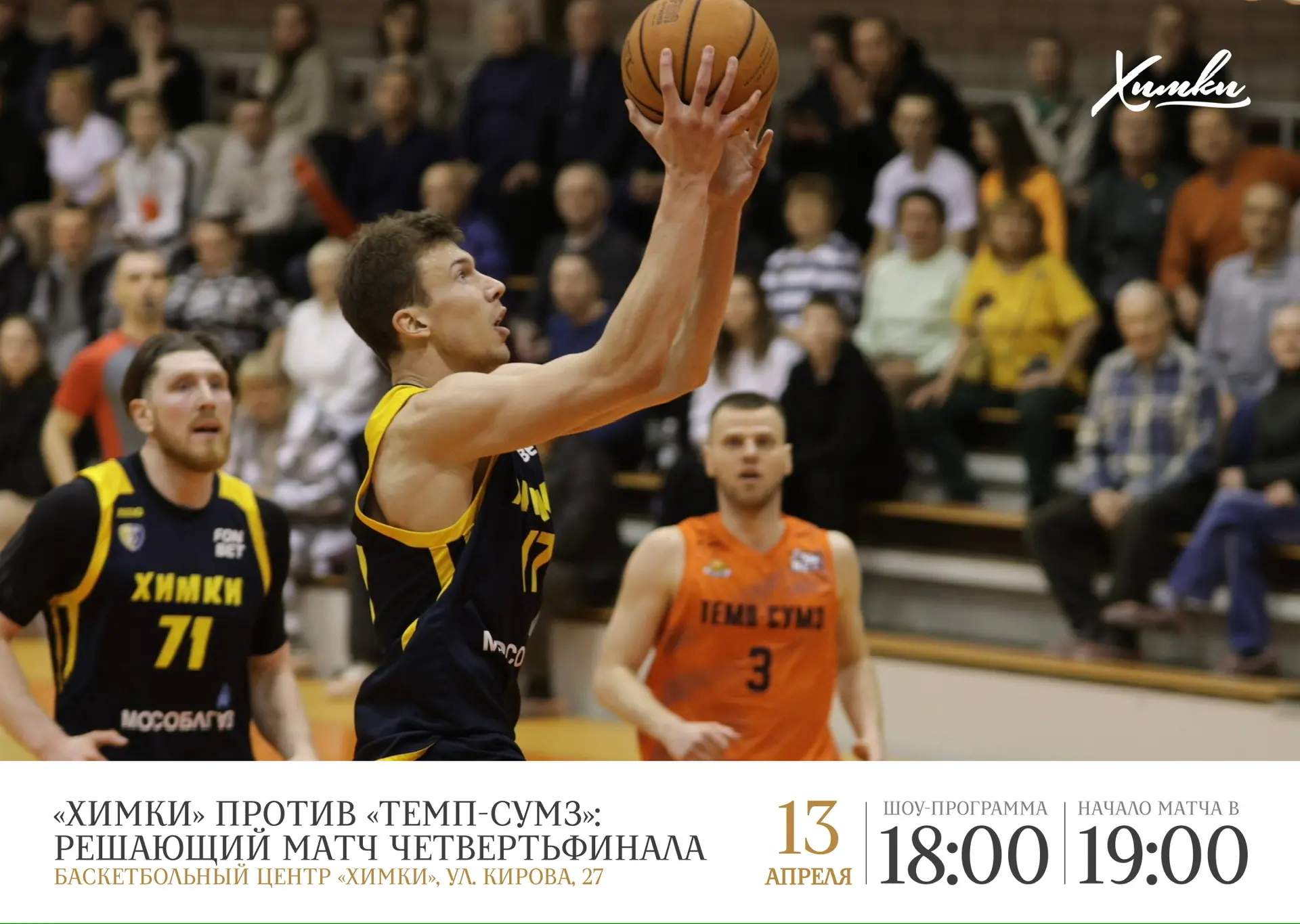 Сегодня, 13 апреля, в Баскетбольном центре «Химки» состоится матч четвертьфинальной серии Чемпионата России (Суперлига): баскетбольный клуб «Химки» сыграет против «Темп-СУМЗ».