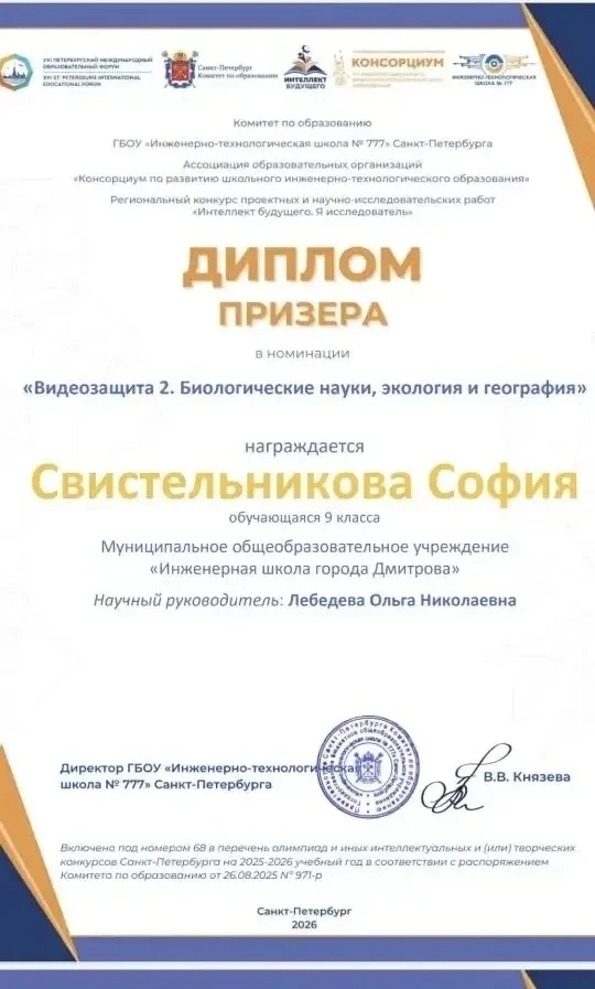 Ученица 9.2 класса Инженерной школы города Дмитрова София Свистельникова стала призёром регионального конкурса проектных и научно-исследовательских работ «Интеллект будущего. Я исследователь».