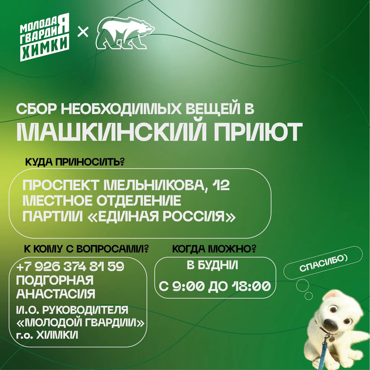 Место передачи помощи:г.о Химки, ул. проспект Мельникова д.12