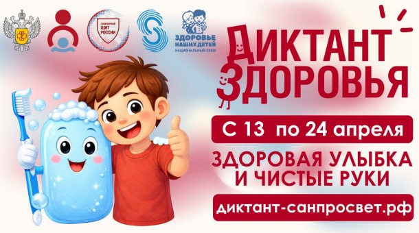 С 13 по 24 апреля Роспотребнадзор запускает первый этап Всероссийской акции «Диктант здоровья». Тема этого года — гигиена полости рта и правильное мытьё рук.