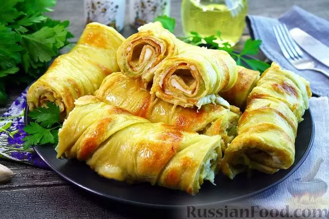 - Блинные рулетики с кабачками: Нежный блин, начиненный кабачками и сыром, запечённый в духовке, станет идеальной закуской на любой праздник или встречу с друзьями.