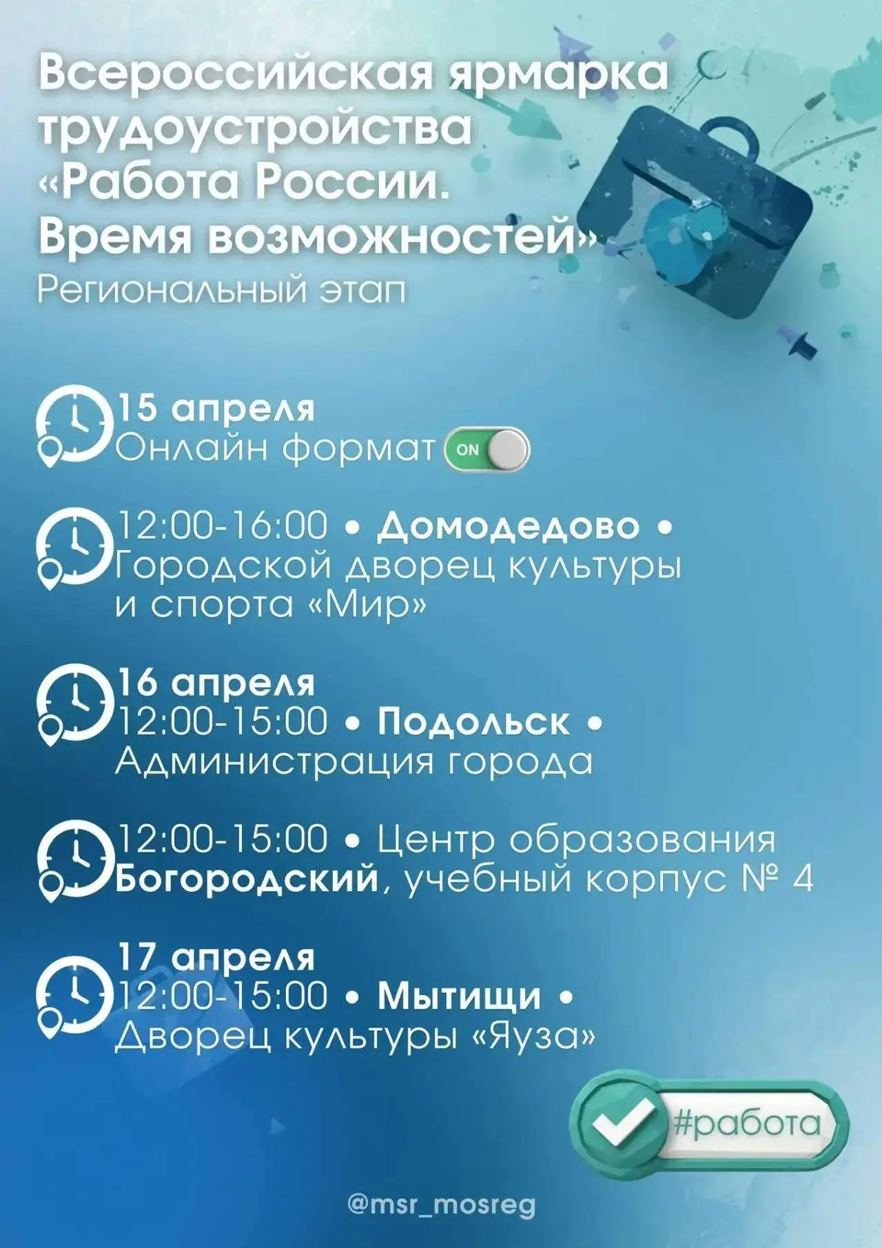 До 17 апреля можно будет посетить четыре офлайн-площадки, а также принять участие в онлайн-формате (регистрация по ссылке https://mosregjob.ru/).