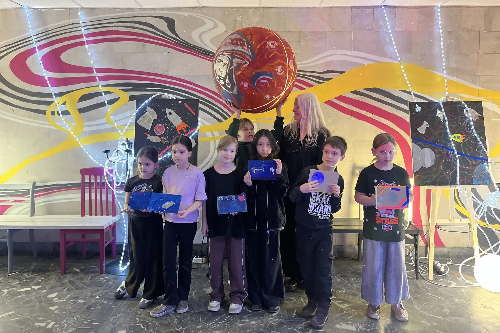 Там же художественная студия «Арт-поколение» представила выставку «Парад планет», а на мастер-классе участники создавали работы, используя жидкий акрил и материалы, имитирующие космический мусор.