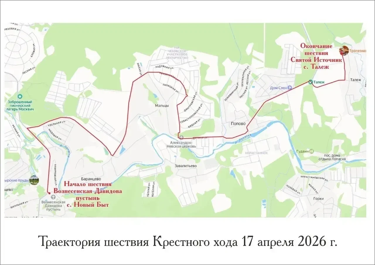 из Вознесенской Давидовой пустыни к источнику преподобного Давида на подворье обители в селе Талеж, с заходом в храм святого благоверного князя Александра Невского в деревне Мальцы.