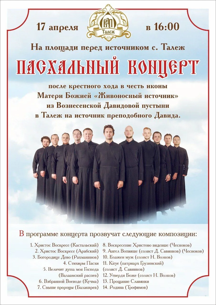 16:00 духовный Пасхальный концерт хора Вознесенской Давидовой пустыни на площади перед источником.