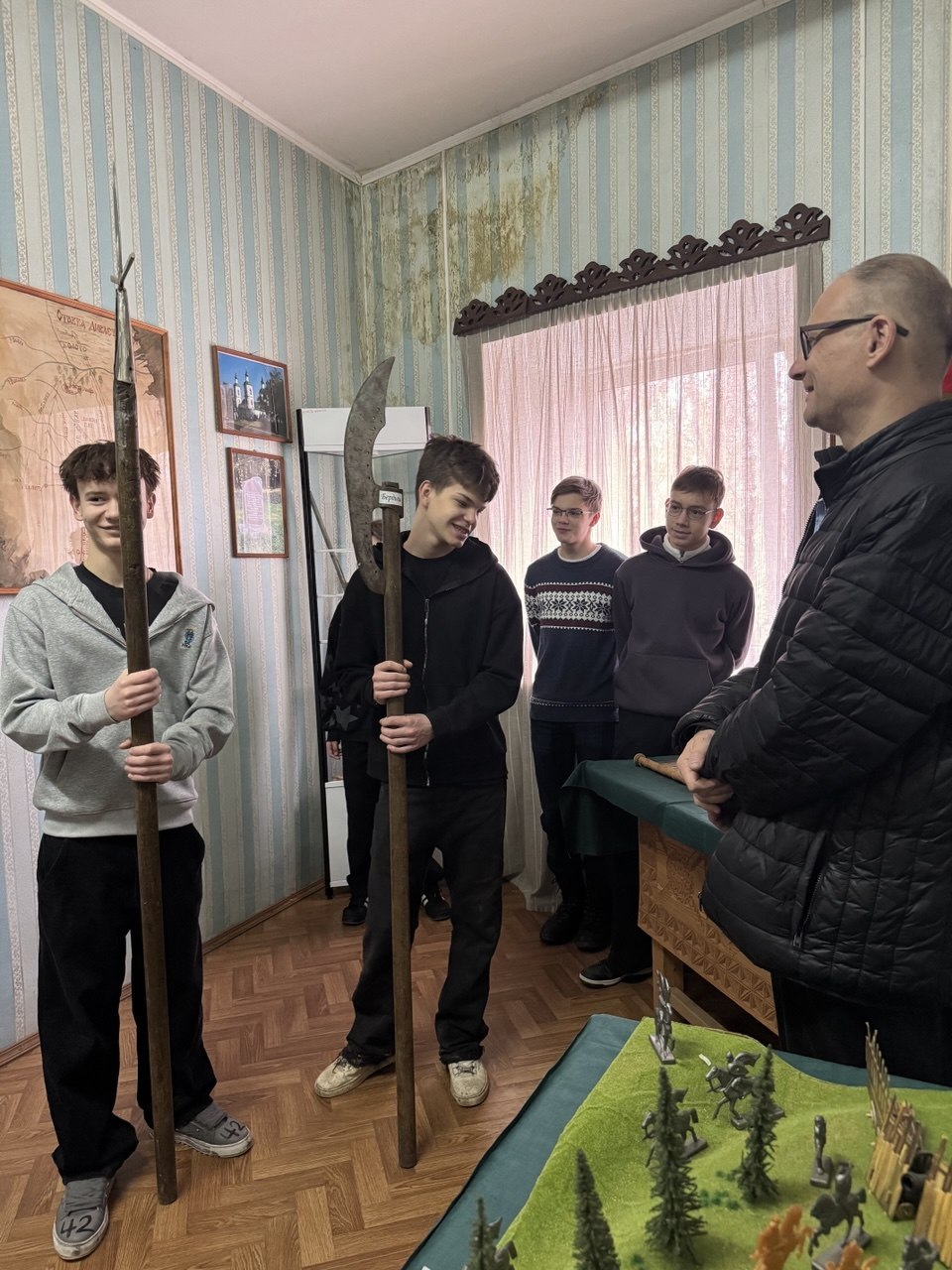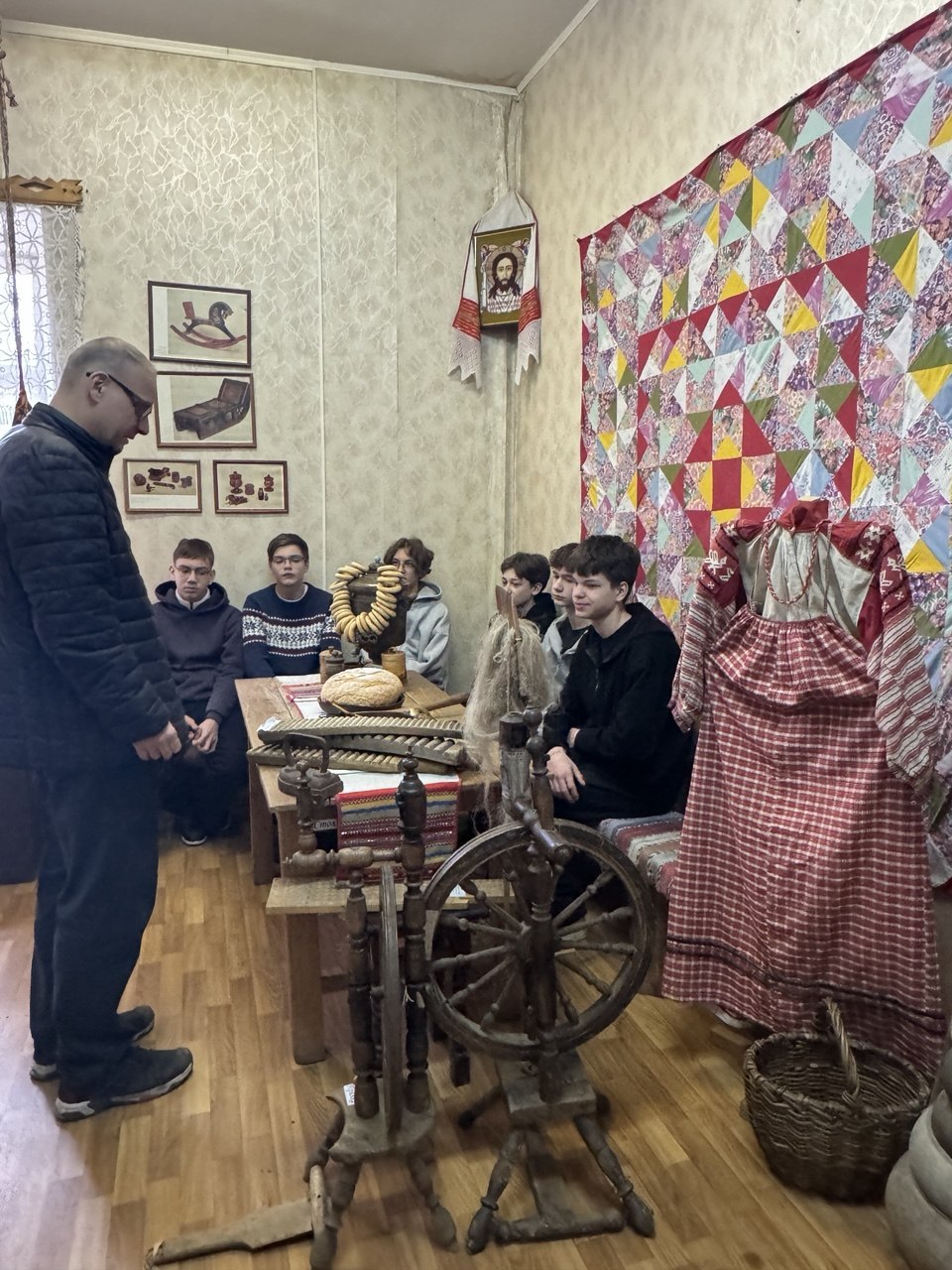 Понять предназначение предметов крестьянского быта и сравнить их с современными аналогами – доминанта экскурсии «По залам музея. Раскрываем тайны Лопасни» Александра Анатольевича Дудина. Это всегда увлекательно, даже если на экскурсии одни мальчишки, как в нашем случае – семиклассники из СОШ № 3 (девчонок, видимо, дождь распугал).