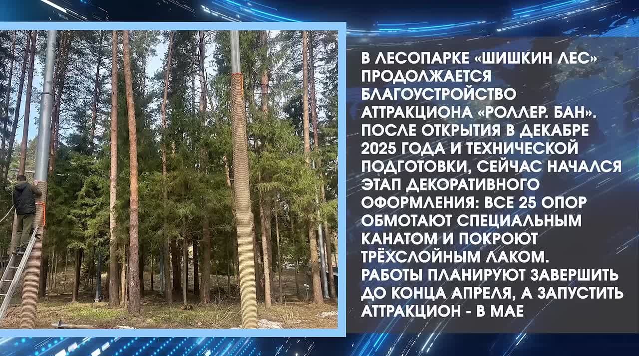 В лесопарке «Шишкин лес» продолжается благоустройство аттракциона «Роллер. Бан». После открытия в декабре 2025 года и технической подготовки, сейчас начался этап декоративного оформления: все 25 опор обмотают специальным канатом и покроют трёхслойным лаком. Работы планируют завершить до конца апреля, а запустить аттракцион - в мае.