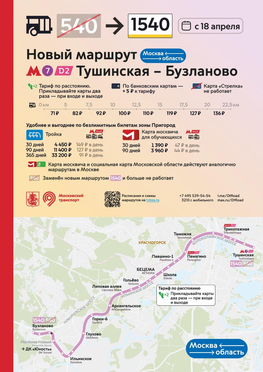 С 18 апреля в Красногорске запускается новый маршрут 1540 от метро «Тушинская» до деревни Бузланово