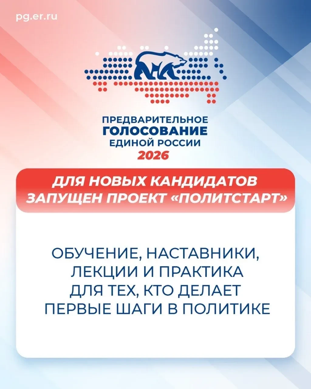 Также мне как кандидату помогает образовательный проект Политстарт, запущенный партией Единая Россия - это специальное кадровое обучение для тех, кто хочет попробовать себя в политике".