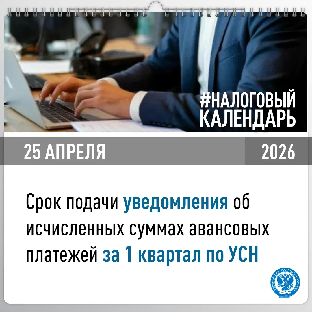 Межрайонная ИФНС России № 2 по Московской области напоминает, что для индивидуальных предпринимателей и организаций применяющих упрощённую систему налогообложения (УСН) 25 апреля 2026 года является крайним сроком представления Уведомлений об исчисленных суммах авансовых платежей по налогу, уплачиваемому в связи с применением УСН. Уведомление подается в налоговый орган по месту учета налогоплательщика.