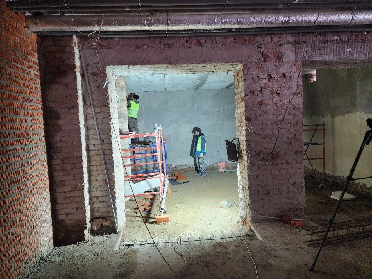 В настоящее время на объекте задействовано 67 человек. Ведутся работы по монтажу перегородок, штукатурке, устройству вентиляции, слаботочных систем, отопления, водоснабжения и электрических сетей. Демонтажные работы выполнены на 88,5% — данный этап практически завершён.