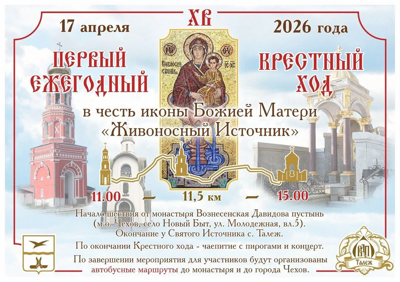 Уже завтра, 17 апреля, в честь иконы Божией Матери «Живоносный Источник» по инициативе благочинного Чеховского церковного округа и монастырей Подольской епархии, настоятеля монастыря Вознесенская Давидова пустынь игумена Сергия (Куксова) и благословению архиепископа Подольского и Люберецкого Аксия состоится