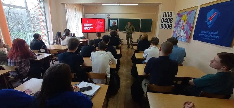 Перед учащимися 9 «А» класса выступили участник специальной военной операции, кавалер ордена Мужества Дмитрий Козлов и начальник местного отделения ВВПОД «Юнармия» Алексей Мовсесян.
