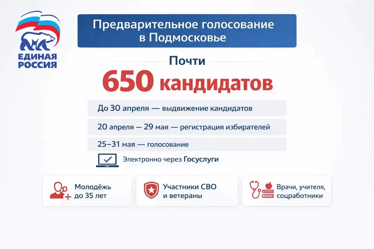 В Подмосковье продолжается предварительное голосование Единой России. На сегодняшний день в процедуре уже зарегистрировались почти 650 человек. Среди участников — представители бюджетной сферы, предприниматели, молодёжь до 35 лет, ветераны СВО.