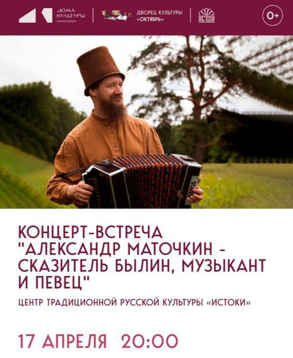 Сказатель былин, музыкант и певец Александр Маточкин проведёт концерт-встречу в конференц-зале Центра традиционной русской культуры.