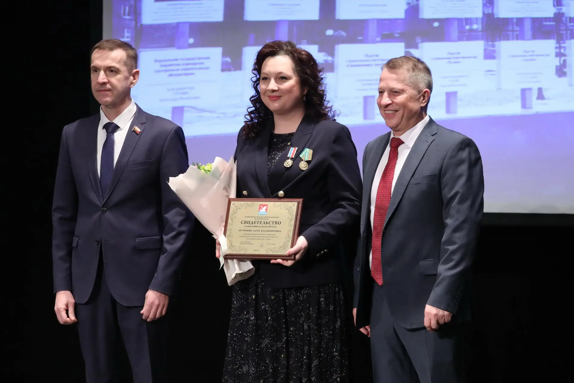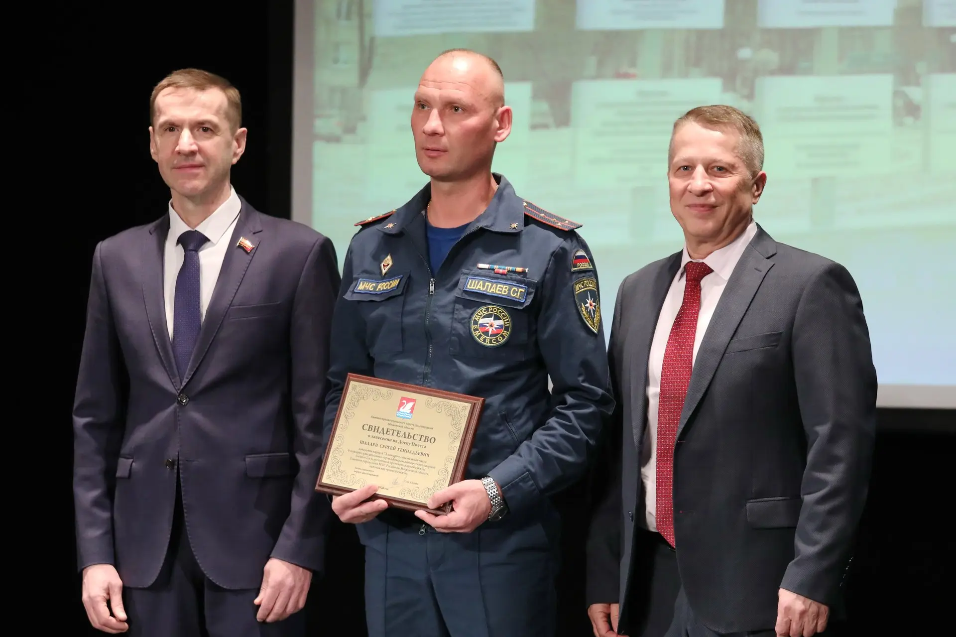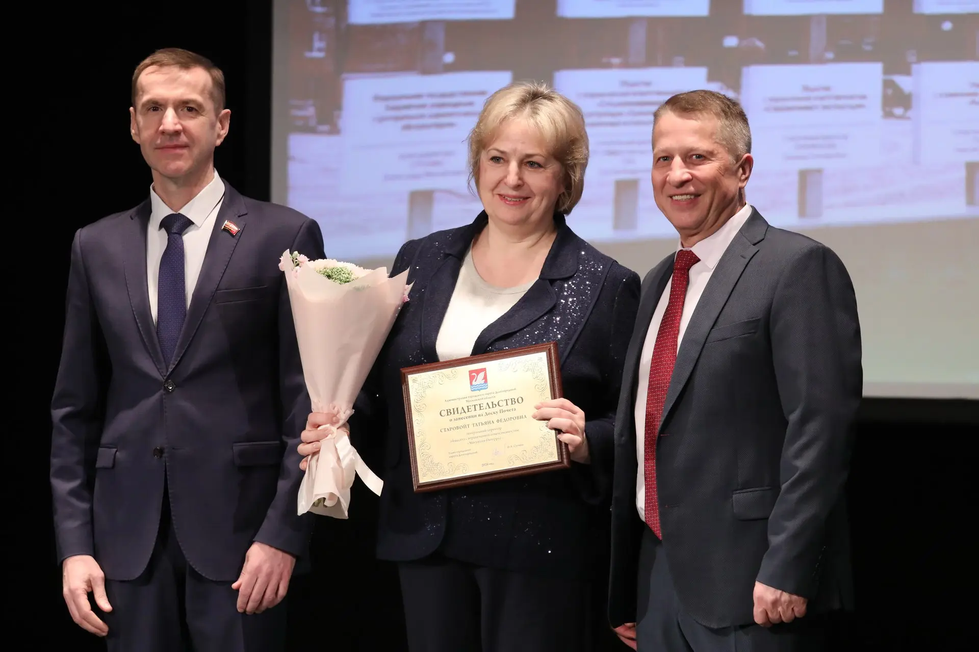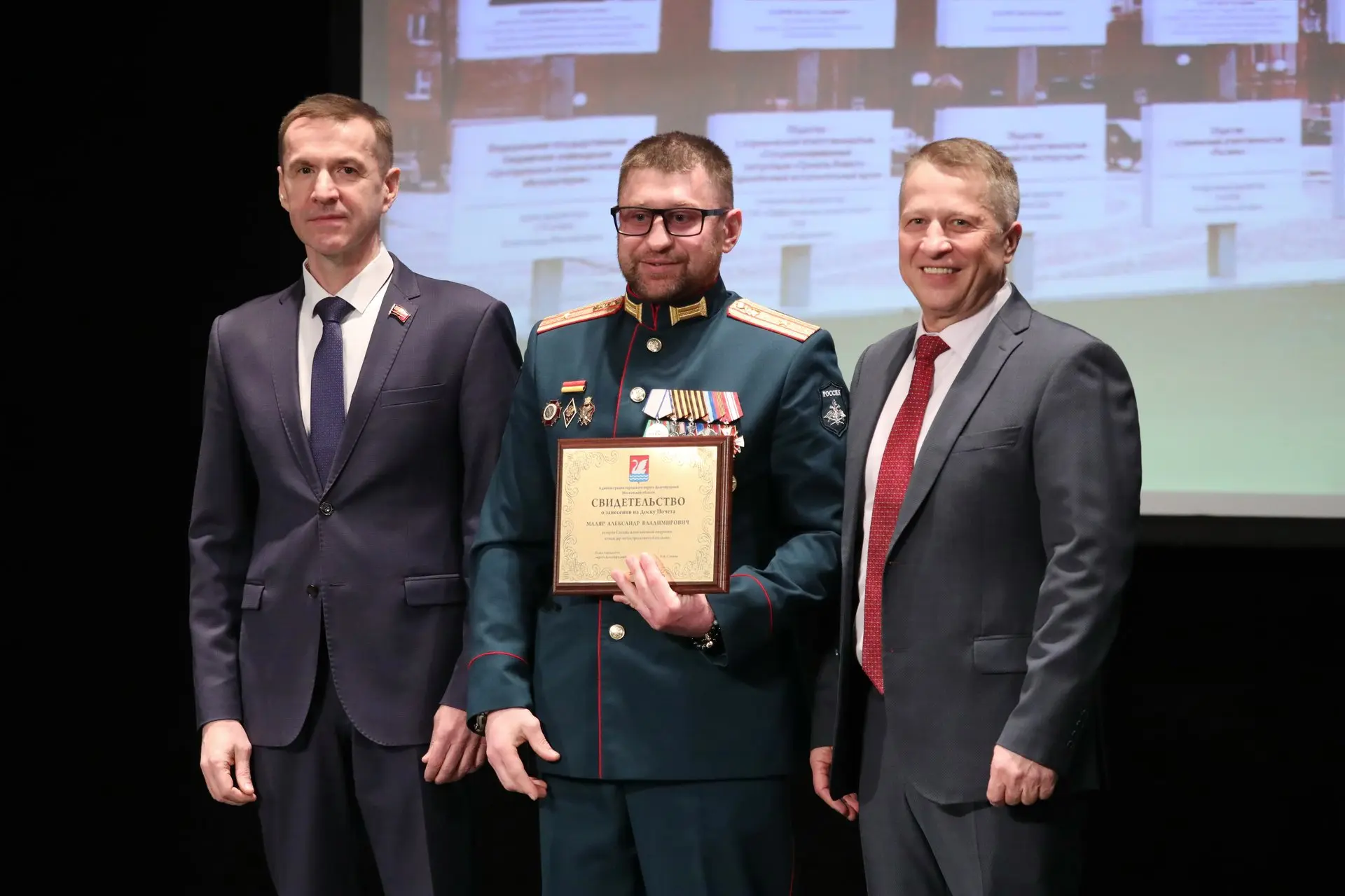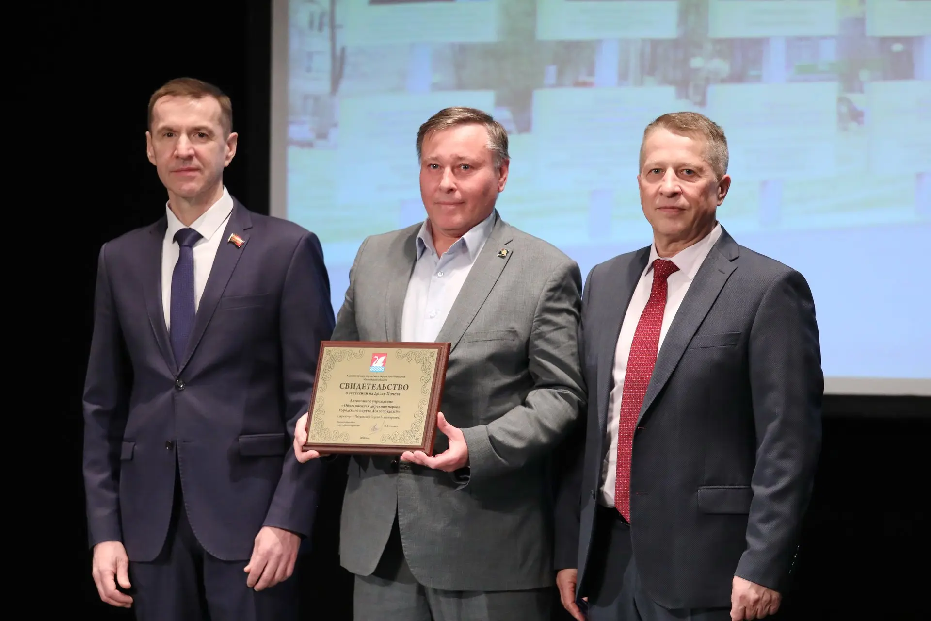 Глава округа Олег Сотник и председатель Совета депутатов Долгопрудного Дмитрий Балабанов вручили передовикам Свидетельства о занесении на Доску Почёта.