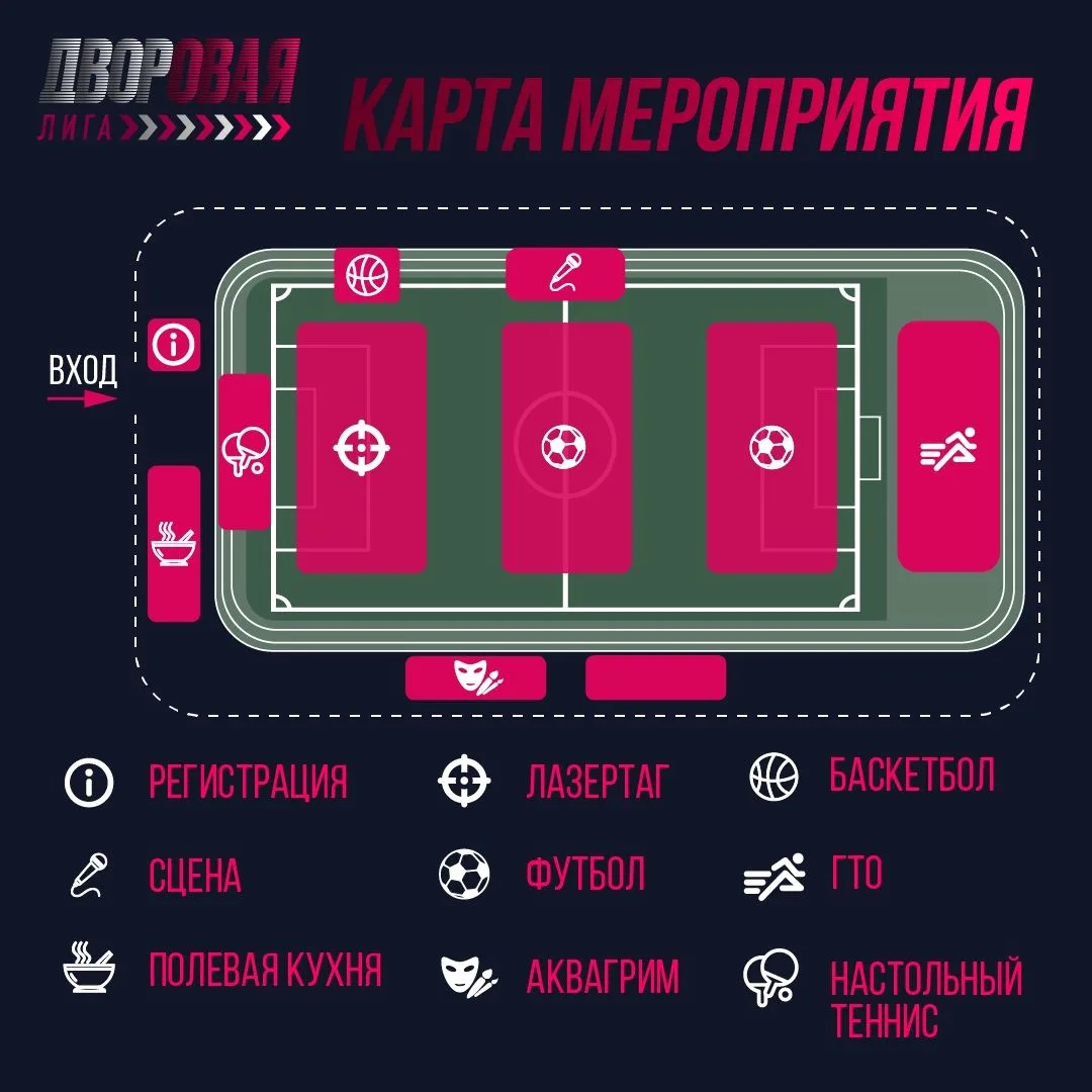 Гостей мероприятия ждут турниры по футболу, настольному теннису и лазертагу, конкурс бросков по баскетболу, а также возможность сдать нормативы ГТО. Помимо спортивных состязаний, для участников и зрителей будут работать полевая кухня, анимация и аквагрим, а самые активные получат призы и подарки от спонсоров.