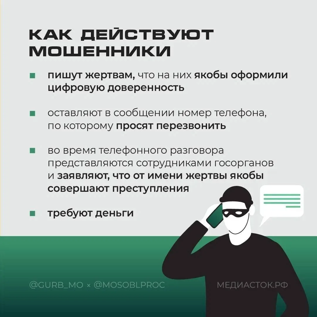 Жертве отправляют электронное письмо о том, что на неё якобы оформлена цифровая доверенность. В сообщении оставляют номер, по которому просят перезвонить.