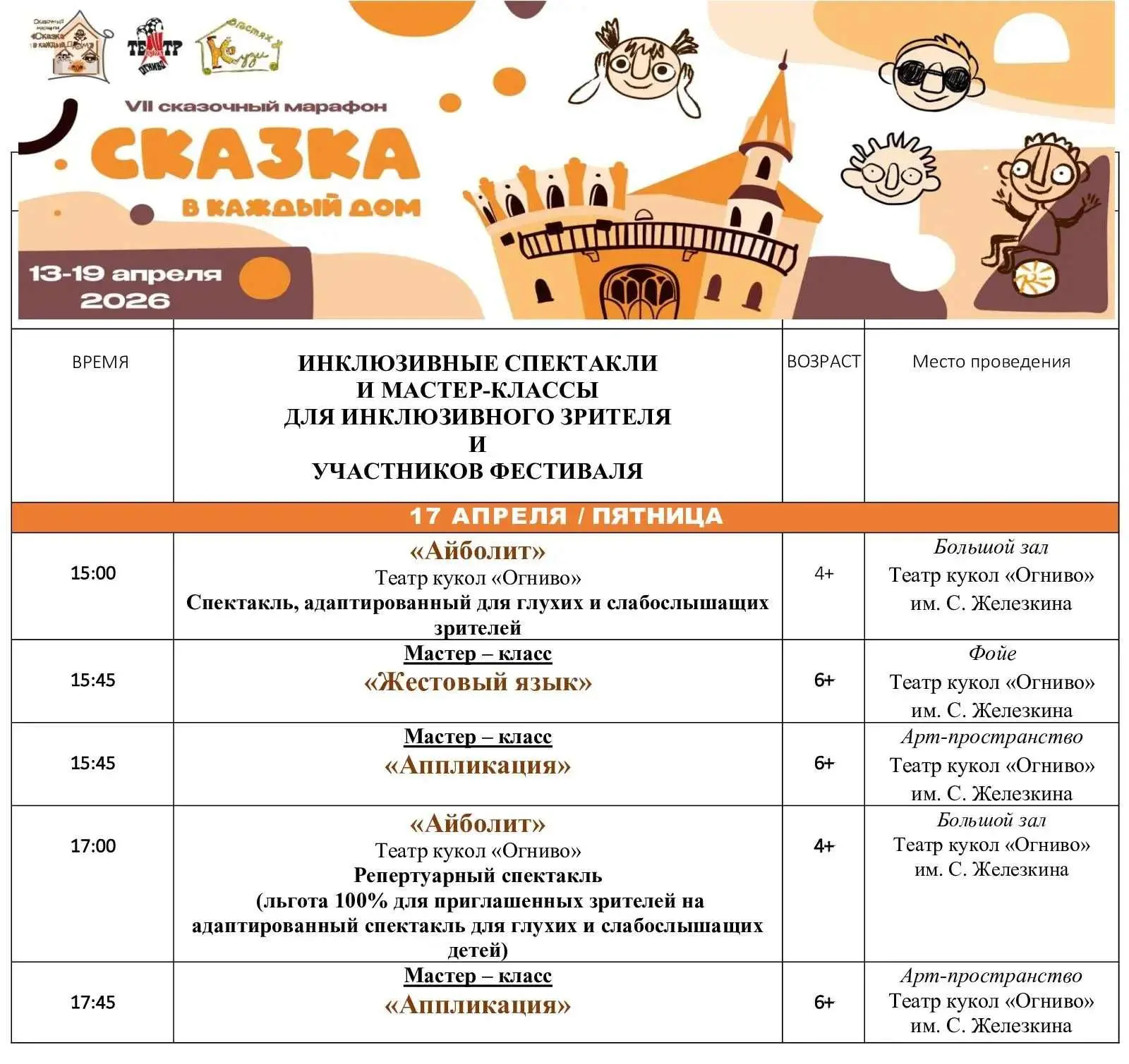 Согласно афише – Спектакли и мастер-классы в рамках VII Сказочного марафона «Сказка в каждый дом». Театр «Огниво», г. Мытищи, ул. Шараповская, д. 4 корп. 1 (6+)