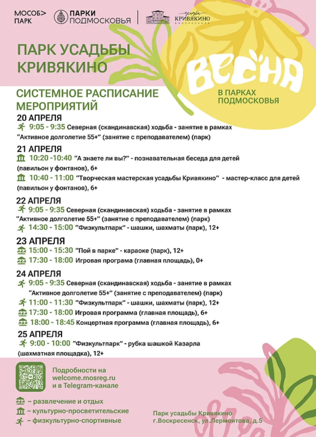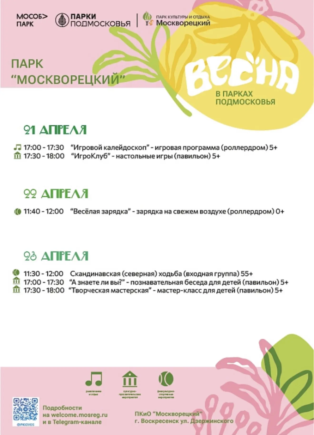 Парки Воскресенска приглашают на мероприятия с 20 по 26 апреля 2026 года.