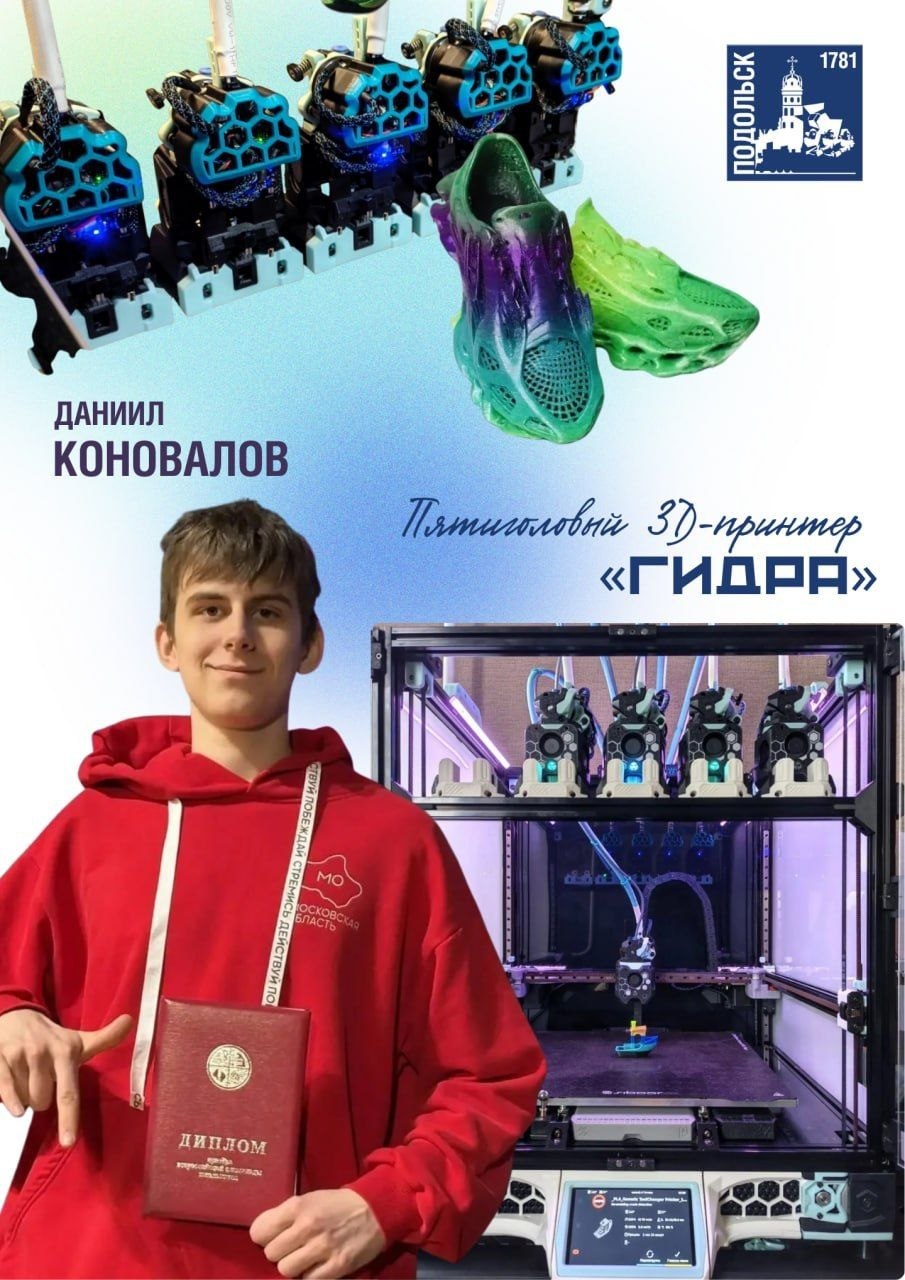 Ребята удивили жюри своими проектами: Даниил представил уникальный пятиголовый 3D-принтер «Гидра», а Софья — авторскую коллекцию одежды «Витражи», для которой брат напечатал стильные аксессуары.