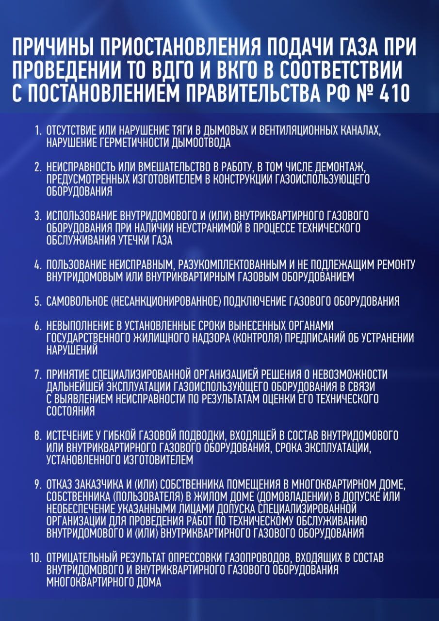 Напомню, что безопасность зависит не только от работы служб, но и от ответственности каждого жителя. Техническое обслуживание внутридомового и внутриквартирного газового оборудования должно проводиться только специализированной организацией. Подача газа может быть временно приостановлена, если обнаружены утечка, неисправность оборудования, проблемы с вентиляцией или дымоходом, самовольное подключение, а также после недопуска специалистов для проведения проверки.