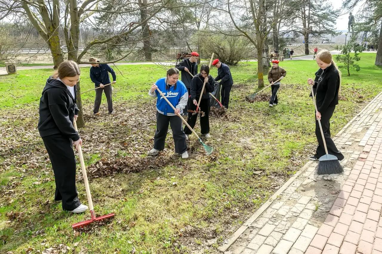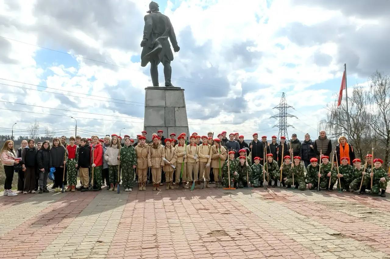 Ребята из юнармейских отрядов вышли на уборку территории у памятника Виктору Талалихину в парке Победы посёлка Кузнечики.