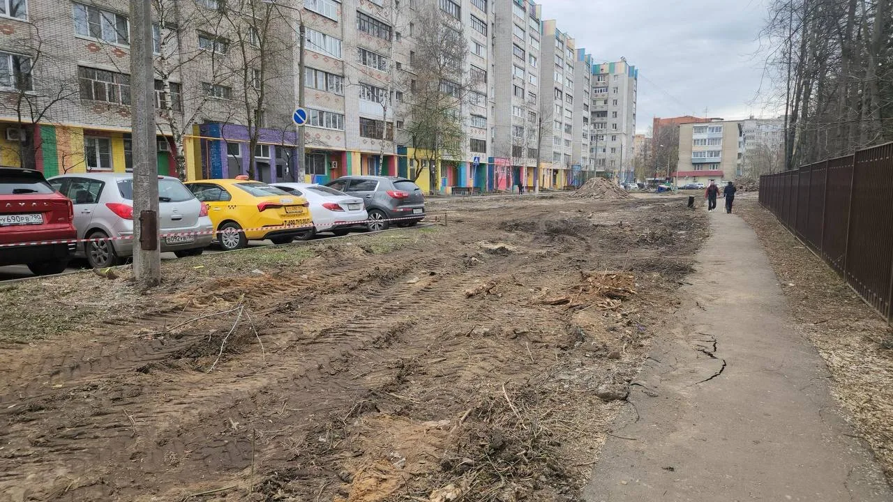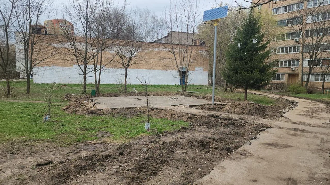 На территории кипят подготовительные работы: здесь демонтируют старые бордюры, снимают асфальт, разбирают детские площадки, выравнивают землю.