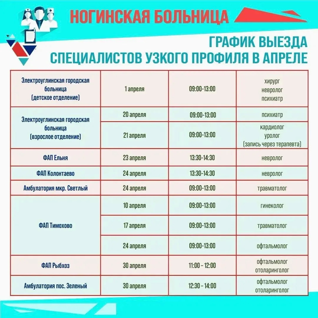 График выезда специалистов узкого профиля Ногинской больницы в апреле