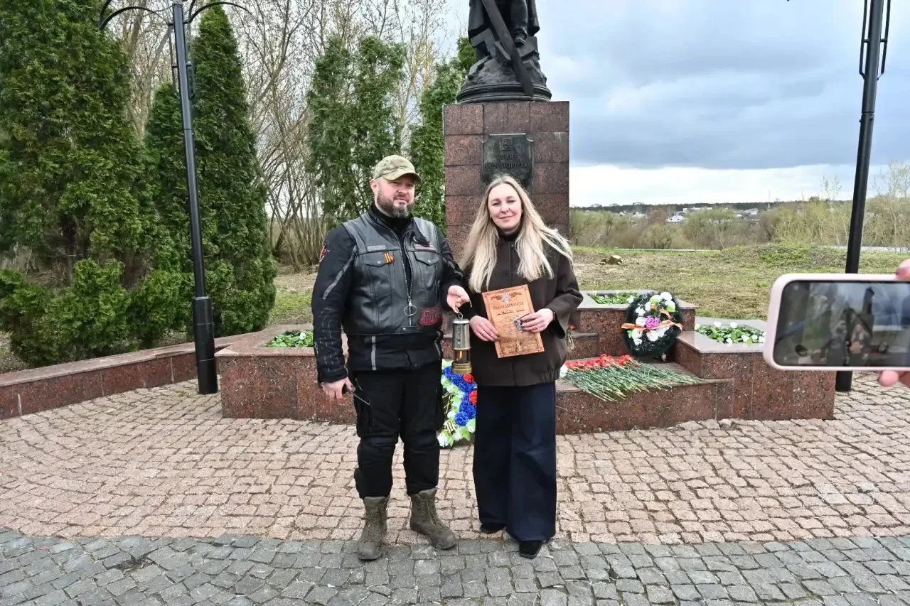 Участники мотомарша передали молодогвардейцам капсулу с землей из Трептов парка, где стоит оригинал памятника «Воину–освободителю», прототип которого расположен на Соборной горе.