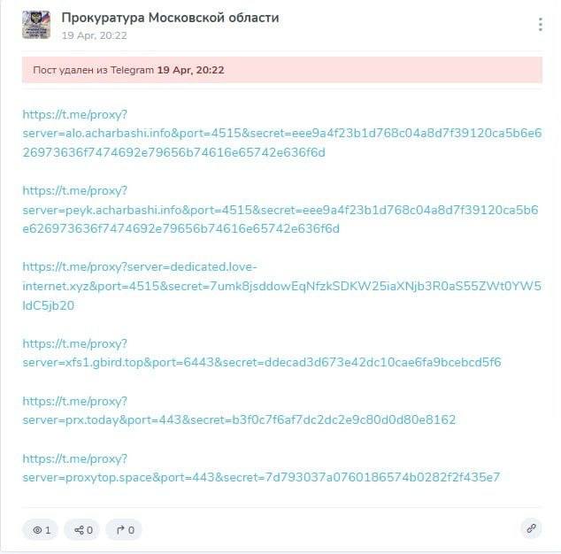 В канале прокуратуры Московской области случайно опубликовали список прокси для обхода блокировок Telegram, но быстро удалили.