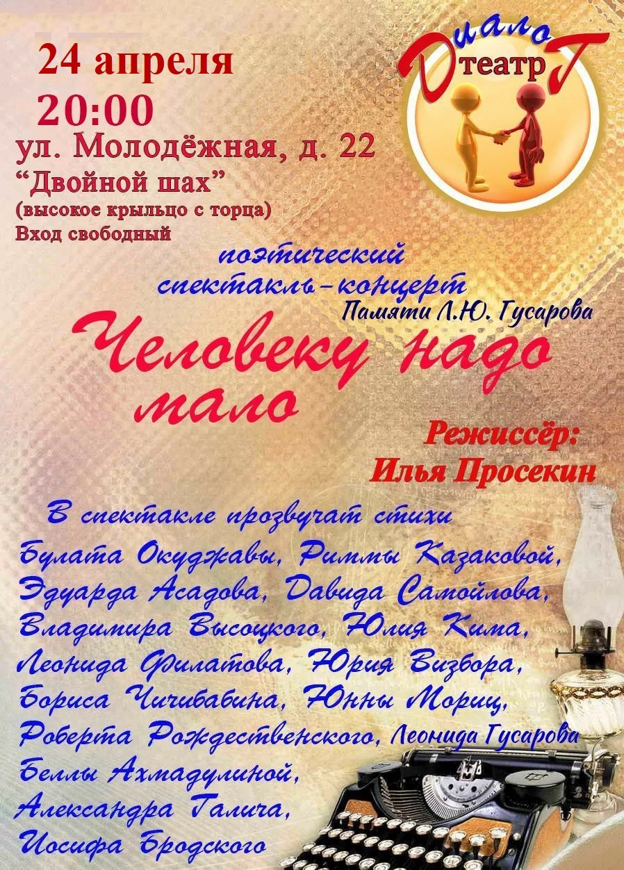 В театре-студии «Диалог» Молодёжного центра «Дружба» состоится показ поэтического спектакля-концерта «Человеку надо мало». Постановка, созданная на основе стихотворений поэтов 1960–1970-х годов, включит в себя произведения Б. Окуджавы, Б. Ахмадулиной, В. Высоцкого, Ю. Кима, Л. Филатова, Ю. Визбора, Е. Евтушенко, Р. Казаковой, Ю. Мориц, Р. Рождественского, А. Галича, Б. Чичибабина и И. Бродского.