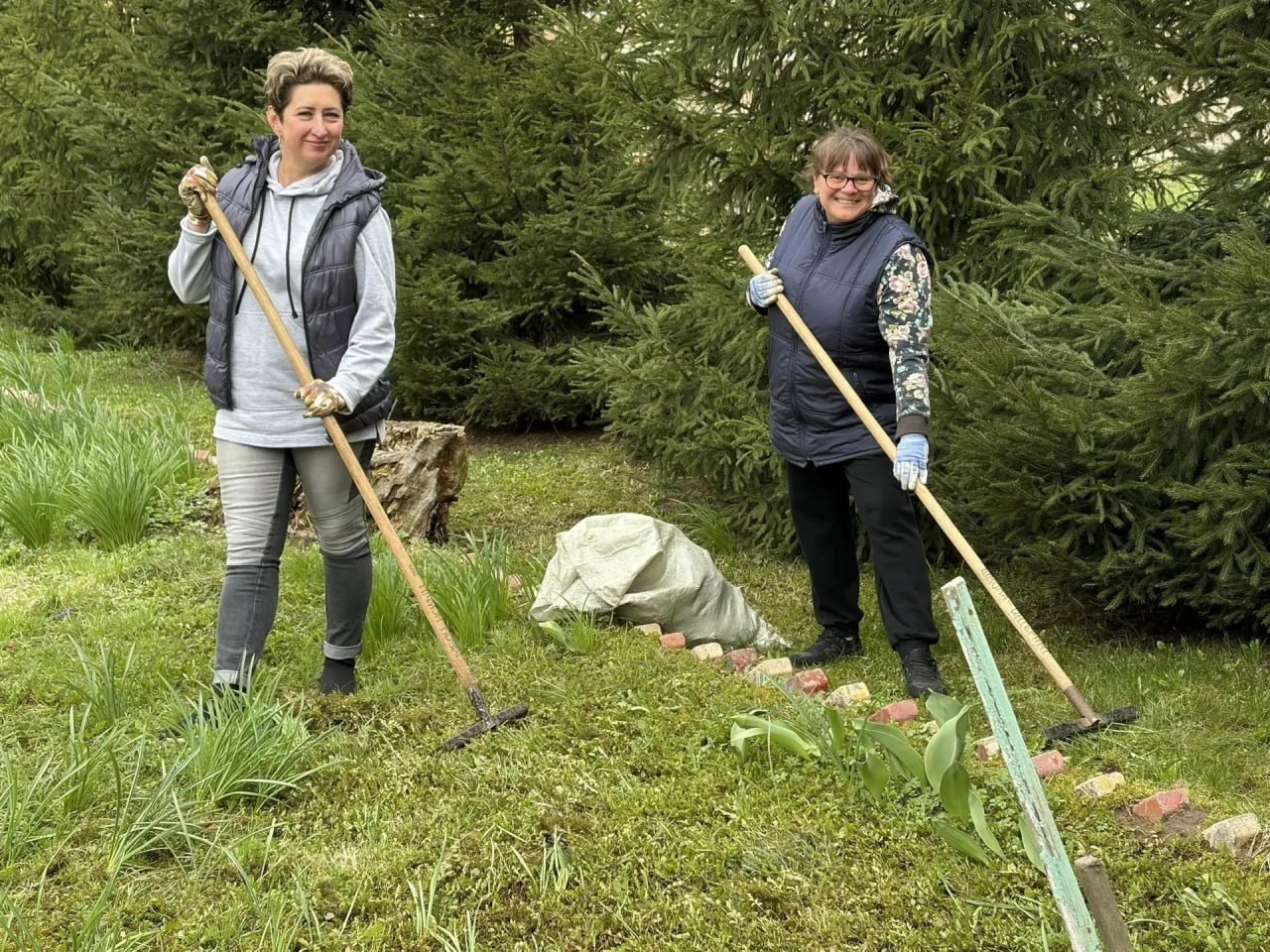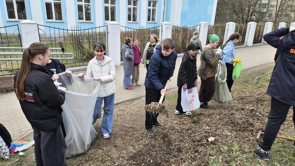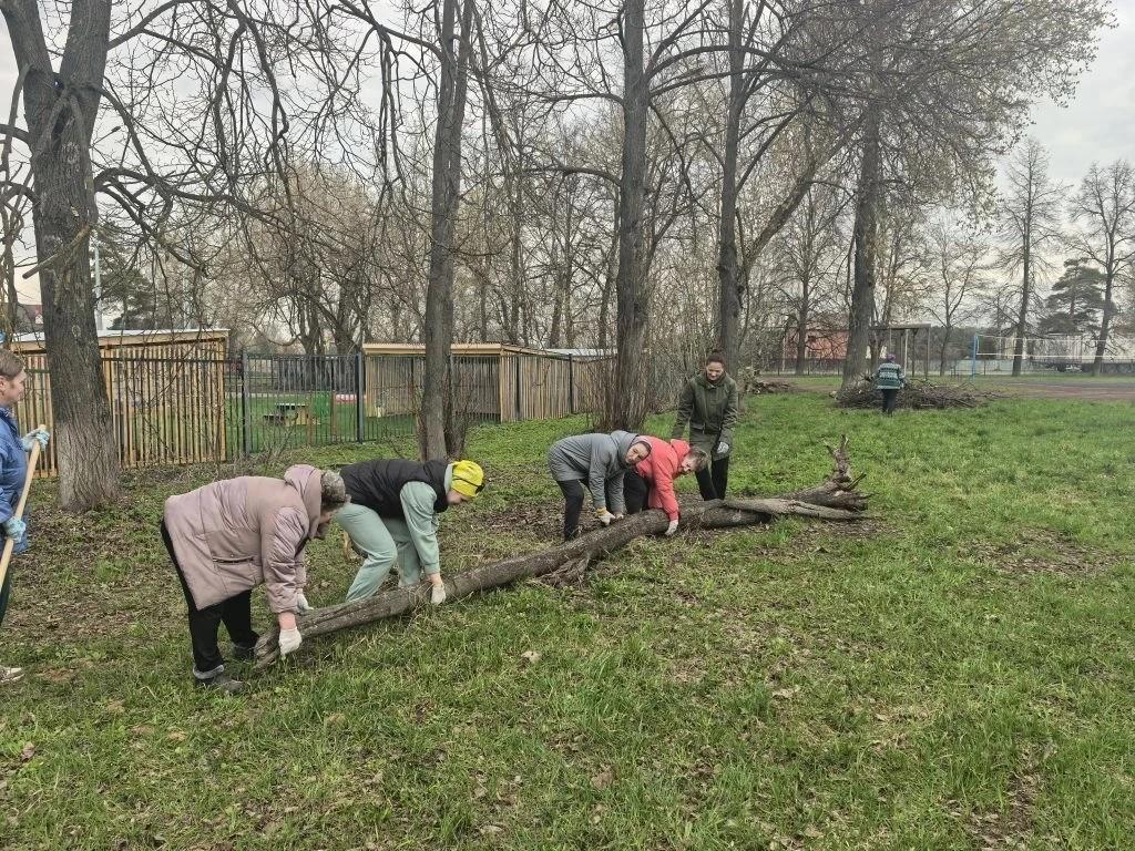 В селе Кудиново (Центр образования №35) уборка организована на двух площадках — в школе и детском саду. В план работ входили очистка территории от листвы и веток, уход за клумбами, подготовка игровых и прогулочных зон к новому сезону.